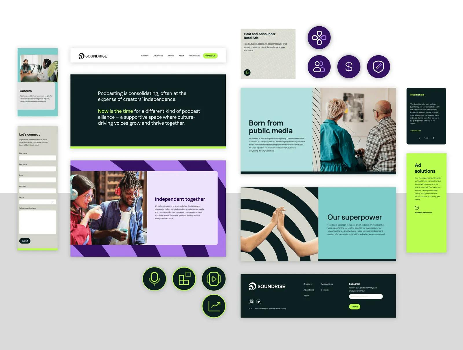 To rally both current and new partners alike around the purpose-driven brand, we crafted the tagline “Together, we rise.” This messaging informed the full breadth of our work with Soundrise. From sales tools to campaign materials, we positioned Soundrise as a powerful alliance of original thinkers and passionate storytellers in audio.
